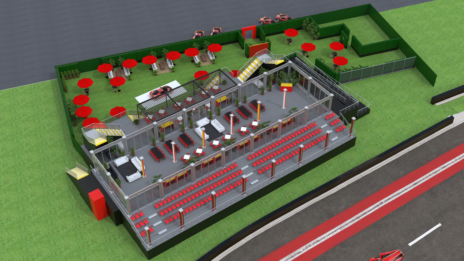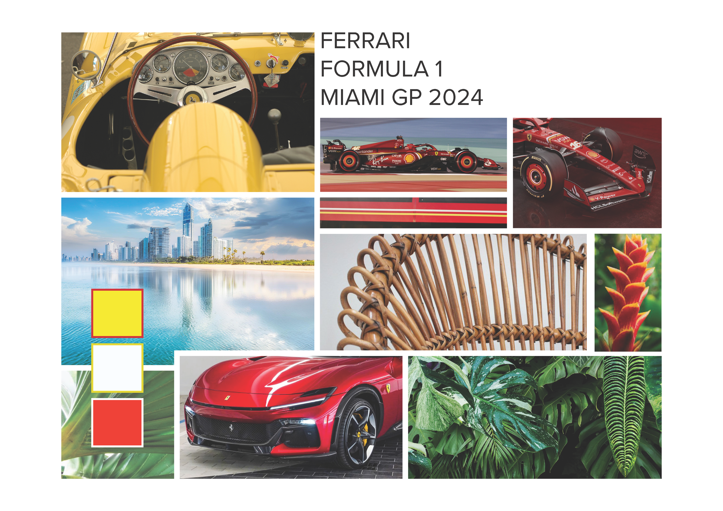 For this new year, Ferrari added in their new racing car the two distinctive lines: yellow and white, and removed much of their black accents from last year. Ferrari yellow comes from the Modena region, Giallo Modena, representing joy, optimism, and speed. These highlights will influence most of my design decisions. As it is in Miami, I took notice of the weather, water, and plants. Incorporating in the garden area Italian rattan seating to accommodate our guests as they explore the area, the water fountain, and the two other floors of this Formula One experience.